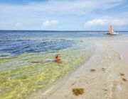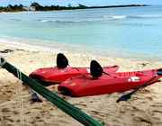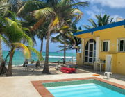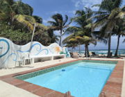 We are right on the beach - literally 30 feet from the ocean.   You can kayak, swim, fish and snorkel And dive right from our property.   Our property has a s 24x12 beach front pool and is on 120 feet  of beachfront by 58 meters deep, with lots of palm trees and sand. We have a  garden with local flowers and plants and some potted plants.